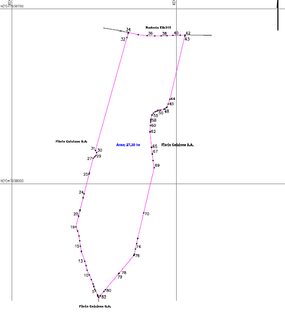 § 1º A área Total possui 27,39 ha, com perímetro de 2.715,385 m, ou seja, 273.900,00 m² (duzentos e setenta e três mil e novecentos metros quadrados), que partindo do marco 1, definido pela coordenada geográfica de Latitude 18º39'04,2785" Sul e Longitude 39º55'57,0954" Oeste, Datum SIRGAS2000 e coordenada plana 7.937.511,0639 m Norte e 401.645,5132 m Leste, deste, confrontando neste trecho com Fibria Celulose S.A. , no quadrante Sudoeste, seguindo com distância de 6,301 m e azimute plano de 331º52'25" chega-se ao marco 2, UTM 7.937.516,6211 m Norte e 401.642,5426 m Leste deste, confrontando neste trecho com Fibria Celulose S.A., no quadrante Sudoeste, seguindo com distância de 3,010 m e azimute plano de 331º52'25"  chega-se ao marco 3, UTM 7.937.519,2761 m Norte e 401.641,1234 m Leste deste, no quadrante Sudoeste, seguindo com distância de 2,704 m e azimute plano de 334º07'08"  chega-se ao marco 4, UTM 7.937.521,7092 m Norte e 401.639,9429 m Leste deste, no quadrante Sudoeste, seguindo com distância de 20,319 m e azimute plano de 334º07'08"  chega-se ao marco 5, UTM 7.937.539,9905 m Norte e 401.631,0734 m Leste deste, no quadrante Sudoeste, seguindo com distância de 7,560 m e azimute plano de 334º07'08"  chega-se ao marco 6, UTM 7.937.546,7924 m Norte e 401.627,7734 m Leste deste, no quadrante Sudoeste, seguindo com distância de 13,061 m e azimute plano de 339º48'52"  chega-se ao marco 7, UTM 7.937.559,0512 m Norte e 401.623,2665 m Leste deste, no quadrante Sudoeste, seguindo com distância de 10,857 m e azimute plano de 339º48'52"  chega-se ao marco 8, UTM 7.937.569,2416 m Norte e 401.619,5201 m Leste deste, no quadrante Sudoeste, seguindo com distância de 20,974 m e azimute plano de 338º45'31"  chega-se ao marco 9, UTM 7.937.588,7903 m Norte e 401.611,9214 m Leste deste, no quadrante Sudoeste, seguindo com distância de 21,133 m e azimute plano de 334º28'11"  chega-se ao marco 10, UTM 7.937.607,8597 m Norte e 401.602,8134 m Leste deste, no quadrante Sudoeste, seguindo com distância de 23,633 m e azimute plano de 334º09'32"  chega-se ao marco 11, UTM 7.937.629,1296 m Norte e 401.592,5123 m Leste deste, no quadrante Sudoeste, seguindo com distância de 20,248 m e azimute plano de 345º49'12"  chega-se ao marco 12, UTM 7.937.648,7609 m Norte e 401.587,5521 m Leste deste, no quadrante Sudoeste, seguindo com distância de 20,353 m e azimute plano de 343º05'04"  chega-se ao marco 13, UTM 7.937.668,2333 m Norte e Leste deste, no quadrante Sudoeste, seguindo com distância de 43,782 m e azimute plano de 339º36'07"  chega-se ao marco 14, UTM 7.937.709,2695 m Norte e 401.566,3704 m Leste deste, no quadrante Sudoeste, seguindo com distância de 22,860 m e azimute plano de 349º00'36"  chega-se ao marco 15, UTM 7.937.731,7105 m Norte e 401.562,0124 m Leste deste, no quadrante Sudoeste, seguindo com distância de 22,925 m e azimute plano de 351º44'38"  chega-se ao marco 16, UTM 7.937.754,3977 m Norte e 401.558,7205 m Leste deste, no quadrante Sudoeste, seguindo com distância de 22,221 m e azimute plano de 351º44'38"  chega-se ao marco 17, UTM 7.937.776,3883 m Norte e 401.555,5296 m Leste deste, no quadrante Sudoeste, seguindo com distância de 20,863 m e azimute plano de 342º15'25"  chega-se ao marco 18, UTM 7.937.796,2588 m Norte e 401.549,1717 m Leste deste, no quadrante Sudoeste, seguindo com distância de 20,582 m e azimute plano de 337º11'49"  chega-se ao marco 19, UTM 7.937.815,2320 m Norte e 401.541,1950 m Leste deste, no quadrante Noroeste, seguindo com distância de 47,179 m e azimute plano de 14º54'33"  chega-se ao marco 20, UTM 7.937.860,8225 m Norte e 401.553,3334 m Leste deste, no quadrante Noroeste, seguindo com distância de 23,673 m e azimute plano de 14º54'33"  chega-se ao marco 21, UTM 7.937.883,6987 m Norte e 401.559,4243 m Leste deste, no quadrante Noroeste, seguindo com distância de 4,690 m e azimute plano de 14º54'33"  chega-se ao marco 22, UTM 7.937.888,2309 m Norte e 401.560,6309 m Leste deste, no quadrante Noroeste, seguindo com distância de 53,371 m e azimute plano de 14º54'33"  chega-se ao marco 23, UTM 7.937.939,8047 m Norte e 401.574,3625 m Leste deste, no quadrante Noroeste, seguindo com distância de 17,331 m e azimute plano de 14º54'33"  chega-se ao marco 24, UTM 7.937.956,5521 m Norte e 401.578,8216 m Leste deste, no quadrante Noroeste, seguindo com distância de 87,891 m e azimute plano de 14º54'33"  chega-se ao marco 25, UTM 7.938.041,4843 m Norte e 401.601,4349 m Leste deste, no quadrante Noroeste, seguindo com distância de 6,106 m e azimute plano de 14º54'33"  chega-se ao marco 26, UTM 7.938.047,3845 m Norte e 401.603,0058 m Leste deste, no quadrante Noroeste, seguindo com distância de 64,290 m e azimute plano de 15º20'01"  chega-se ao marco 27, UTM 7.938.109,3860 m Norte e 401.620,0065 m Leste deste, no quadrante Noroeste, seguindo com distância de 9,242 m e azimute plano de 49º31'00"  chega-se ao marco 28, UTM 7.938.115,3864 m Norte e 401.627,0362 m Leste deste, no quadrante Noroeste, seguindo com distância de 8,139 m e azimute plano de 42º30'51"  chega-se ao marco 29, UTM 7.938.121,3858 m Norte e 401.632,5364 m Leste deste, no quadrante Noroeste, seguindo com distância de 11,952 m e azimute plano de 15º46'49"  chega-se ao marco 30, UTM 7.938.132,8871 m Norte e 401.635,7867 m Leste deste, no quadrante Sudoeste, seguindo com distância de 11,280 m e azimute plano de 332º26'07"  chega-se ao marco 31, UTM 7.938.142,8863 m Norte e 401.630,5670 m Leste deste, no quadrante Noroeste, seguindo com distância de 504,348 m e azimute plano de 16º32'53"  chega-se ao marco 32, UTM 7.938.626,3449 m Norte e 401.774,2161 m Leste deste, no quadrante Noroeste, seguindo com distância de 19,560 m e azimute plano de 16º32'53"  chega-se ao marco 33, UTM 7.938.645,0946 m Norte e 401.779,7871 m Leste deste, no quadrante Noroeste, seguindo com distância de 5,089 m e azimute plano de 16º32'53"  ch